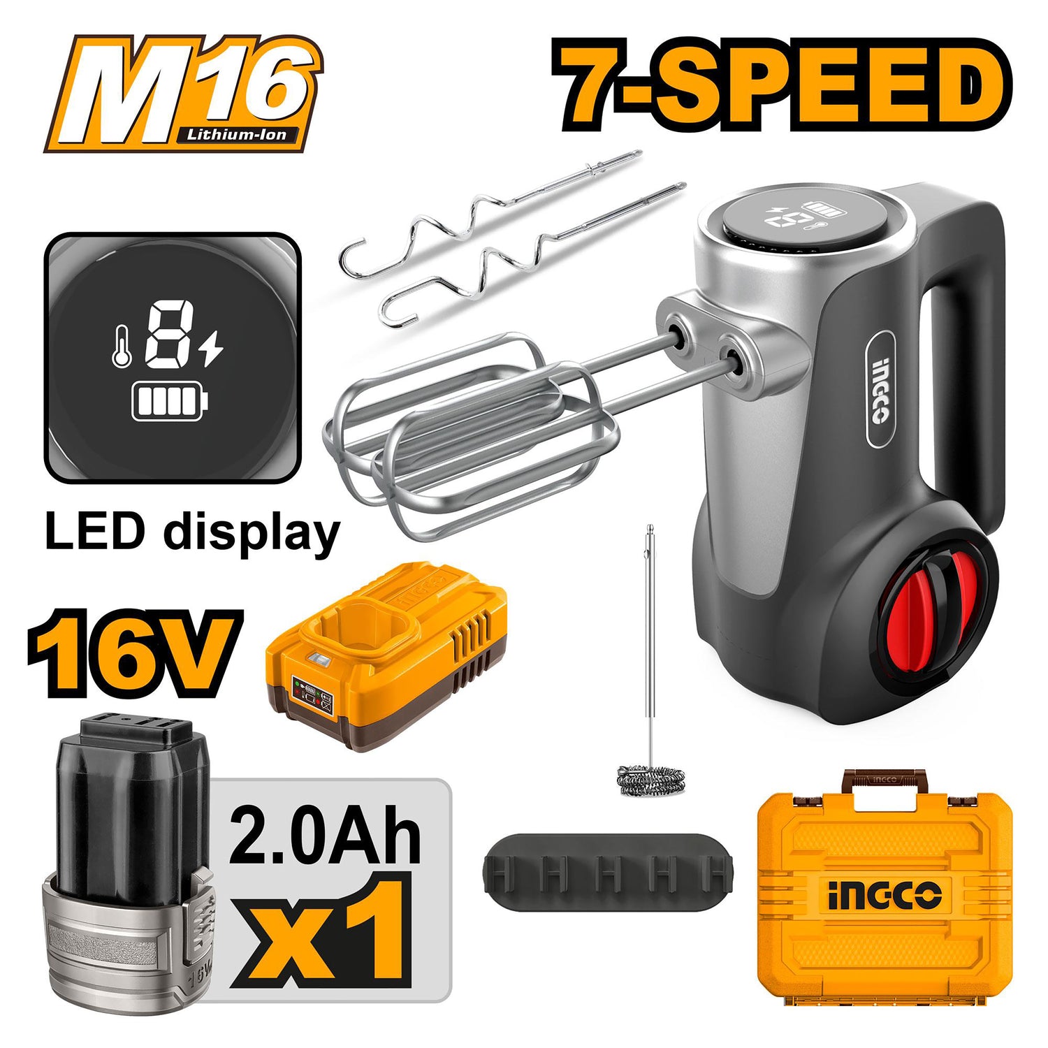 Ingco 16V/M16 Lithium-Ion Cordless Hand Mixer 125W with 7-Speed Control ING-COR