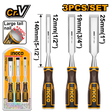 - Set includes three chisels of varying widths for versatile woodworking applications.