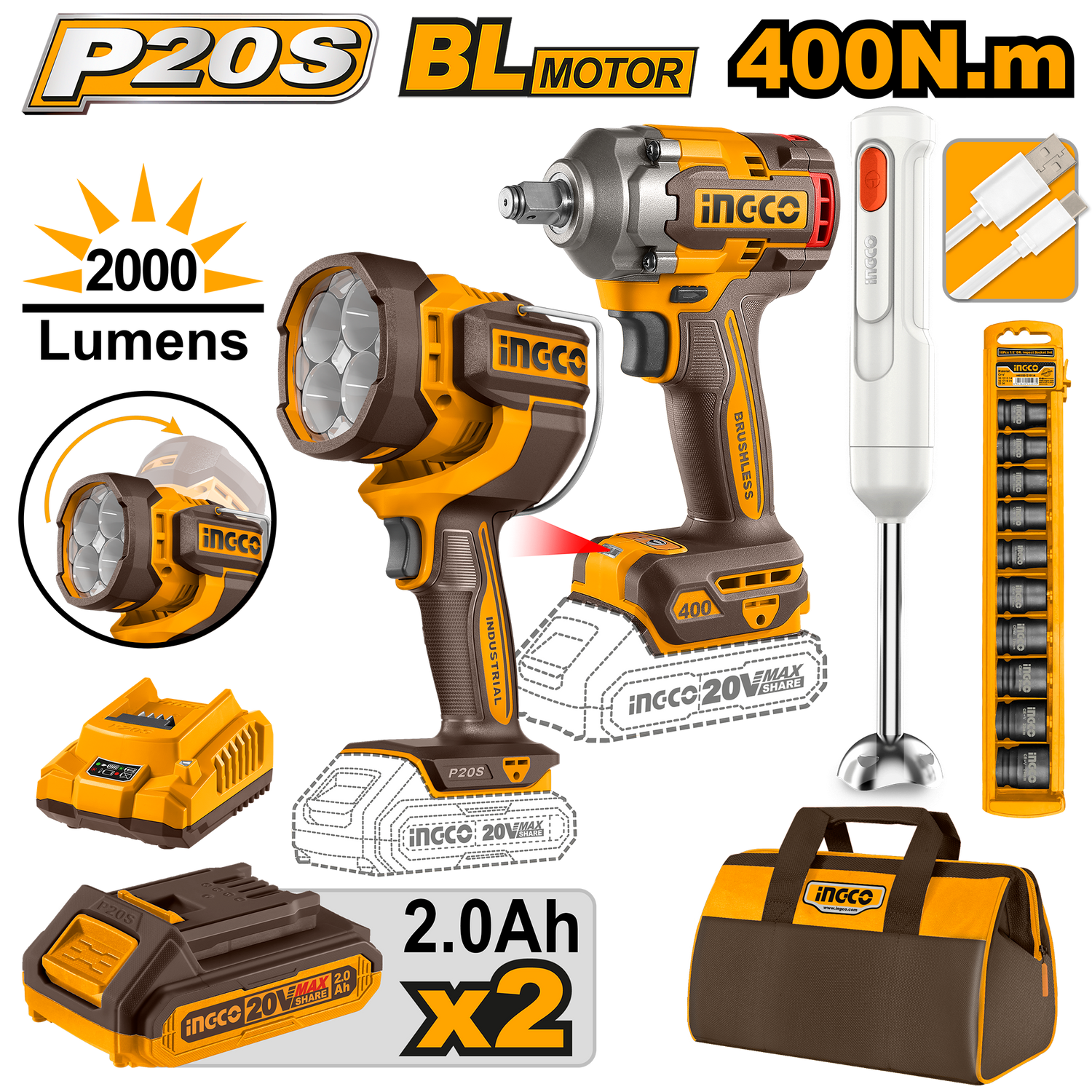 P20S/20V 4PCS Combo Kit with Lithium-Ion Cordless Impact Wrench COSLI240961 ING-COR
