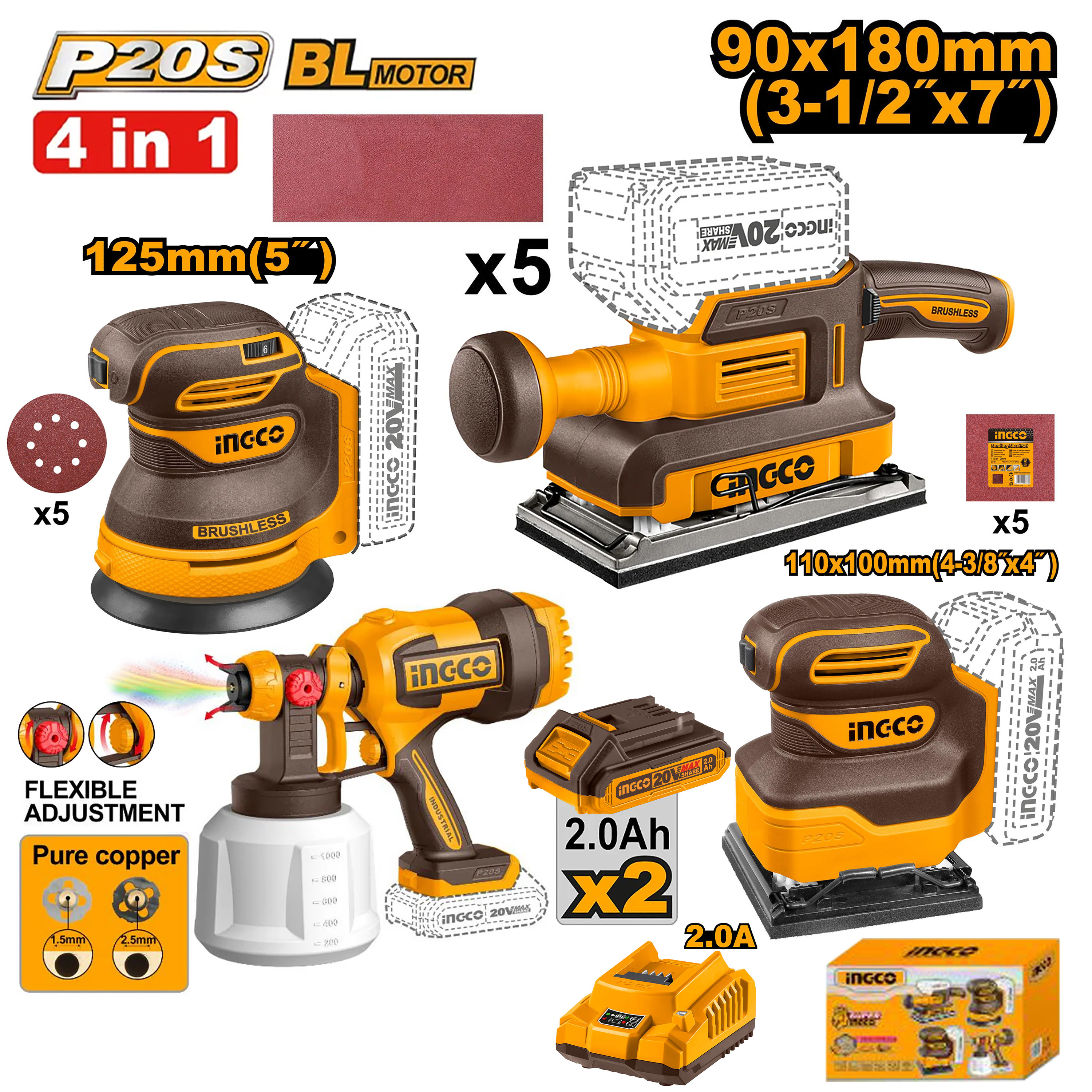 The INGCO COSLI250383 is a 20V cordless combo set that includes a powerful polisher and a paint sprayer, designed for smooth finishing and precise coating.