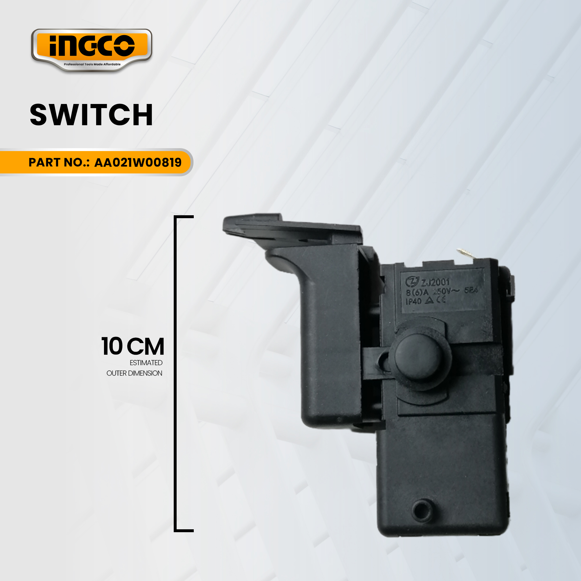 INGCO Switch (AA021W00819) for the RGH6508 Rotary Hammer (650W) is the component that controls the power and speed functions of the tool. It is typically a multi‑function trigger switch that allows the user to: turn the motor on/off; vary the rotation speed depending on how far the trigger is pressed; and change between forward and reverse rotation. It is designed to handle the voltage and current demands of a 650‑watt motor (220‑240V, 50‑60Hz) and built to fit securely into the housing of the RGH6508 model, matching its durability, insulation, and ergonomic needs.