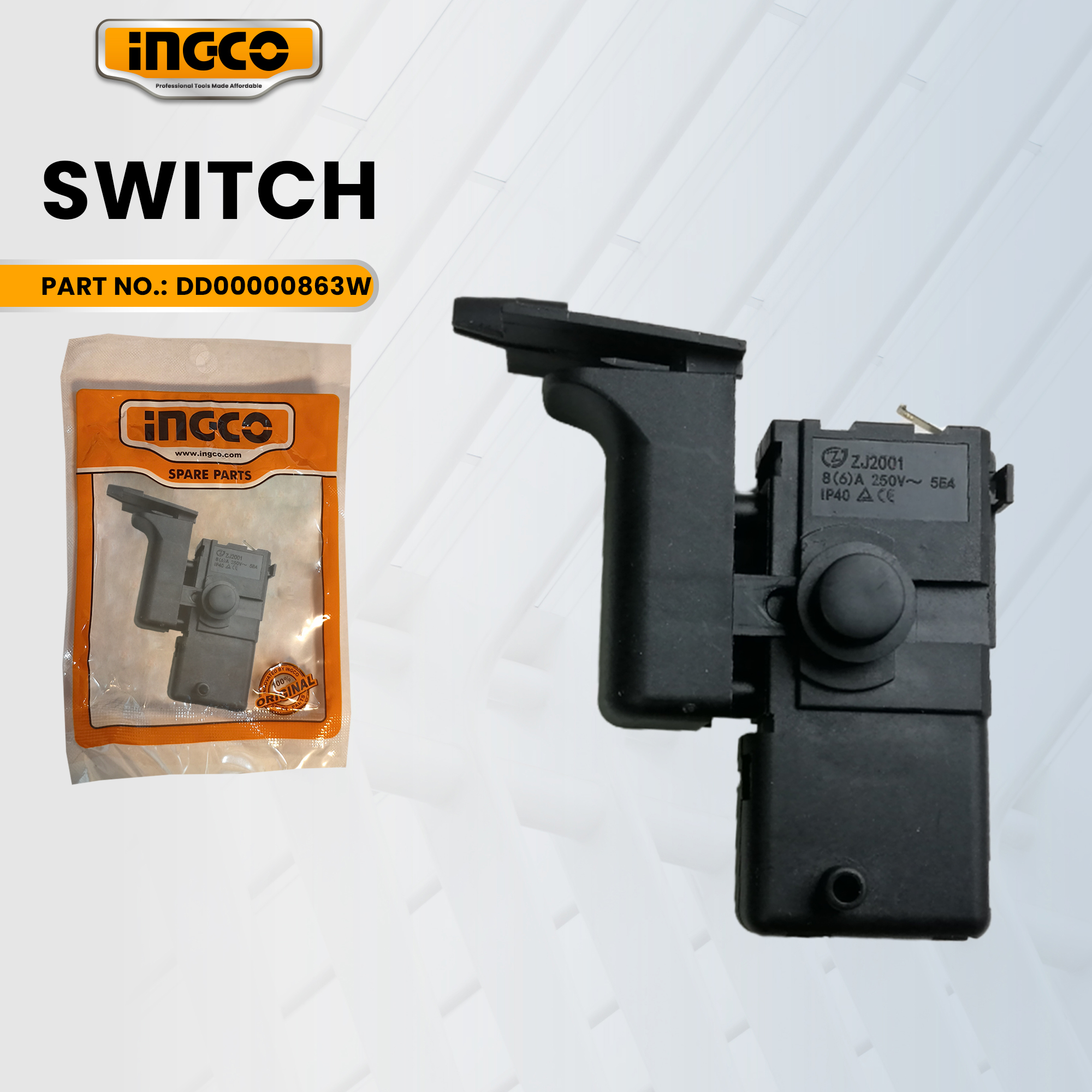INGCO Switch (DD00000863W) is a replacement switch designed for the INGCO RGH9528 Rotary Hammer. This switch allows for the control of the hammer's operation, enabling users to turn the tool on and off as needed. Regular maintenance and timely replacement of the switch ensure the tool's longevity and consistent performance.