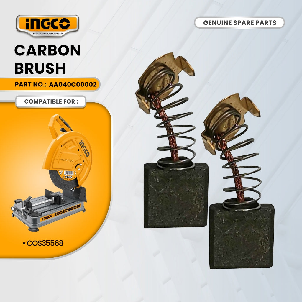INGCO Carbon Brush (AA040C00002) Replacement carbon brushes for the INGCO COS35568 14" Cut-Off Saw, with power ratings between 2200W and 2400W. These brushes are essential for maintaining proper electrical contact within the motor. Over time, they wear out and need to be replaced to ensure smooth and efficient tool performance. This set includes two brushes for easy installation.