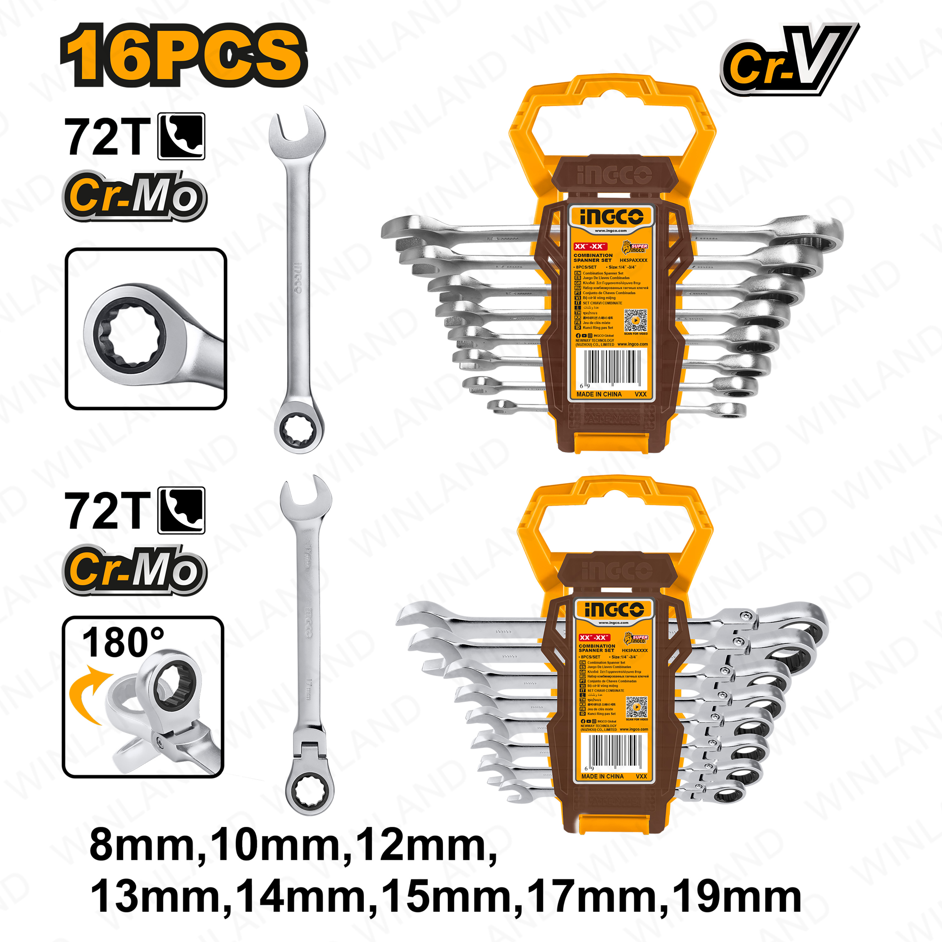Ingco Set of 16 PCS Ring Ratchet Spanner Set HKSPAR2016 ING-HT
