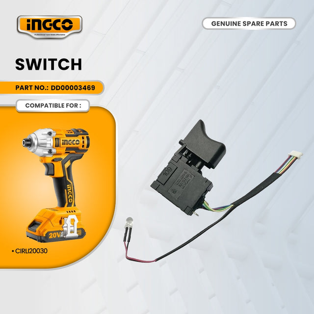 INGCO Switch (DD00003469) is a replacement part for the CIRLI20030 20V Cordless Impact Driver. This switch allows users to restore functionality