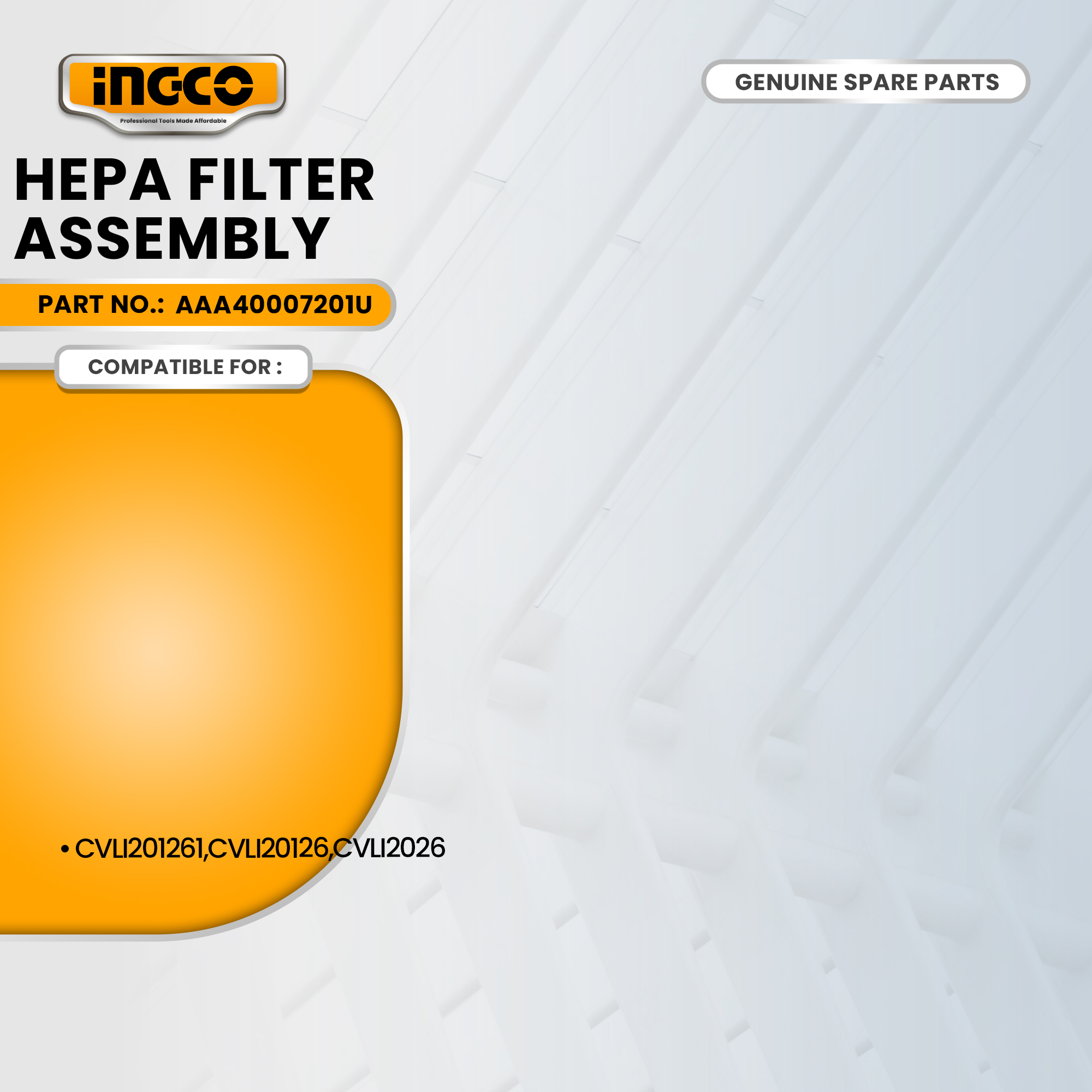 INGCO AAA40007201U is a HEPA filter assembly designed specifically for the INGCO CFALI2001 (also CVLI2001) 20V Li-Ion cordless vacuum cleaner.